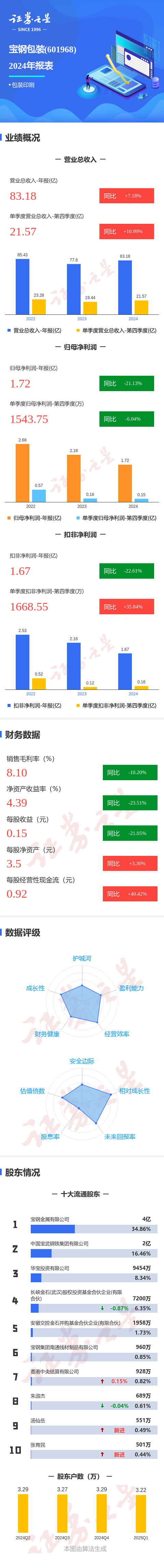 证券之星消息,宝钢包装2024年年报显示,公司主营收入83.18亿元,同比上升7.19%;归母净利润1.72亿元,同比下降21.13%;扣非净利润1.67亿元,同比下降22.62%;其中2024年第四季度,公司单季度主营收入21.58亿元,同比上升11.0%;单季度归母净利润1543.75万元,同比下降6.04%;单季度扣非净利润1668.55万元,同比上升35.85%;负债率52.43%,投资收益-2574.72万元,财务费用56.48万元,毛利率8.1%。