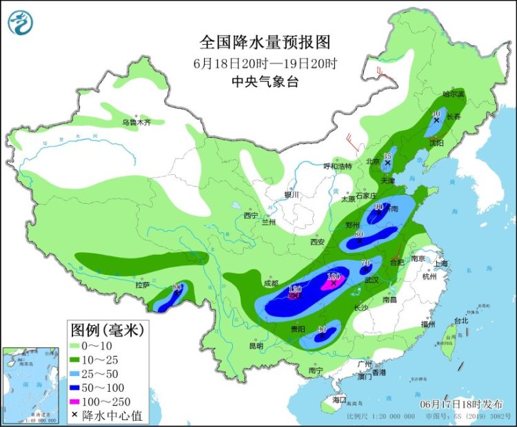 图3 全国降水量预报图(6月18日20时-19日20时)