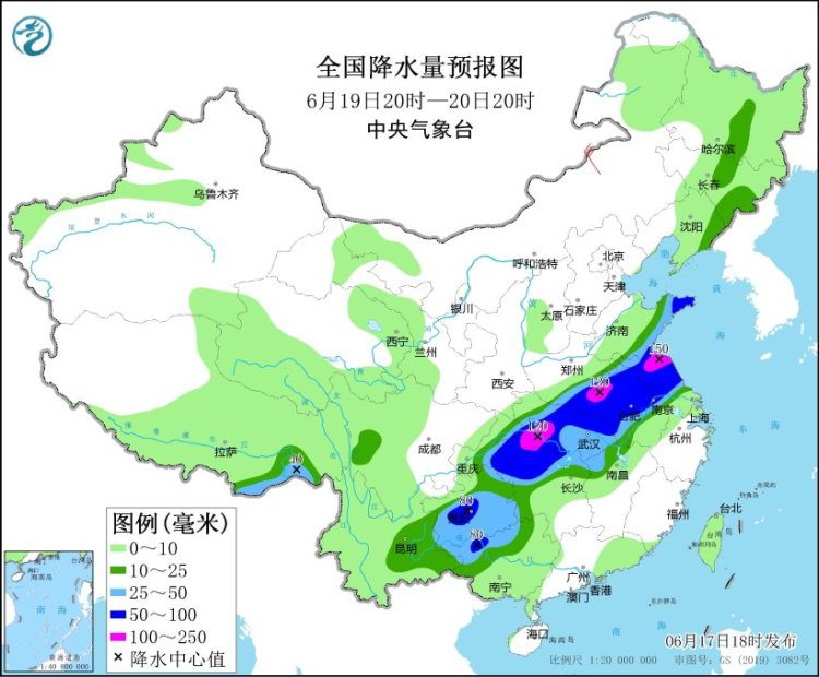 6月19日20时至20日20时,黄淮南部、江淮大部、江汉、江南北部和西部、西南地区东部、广西西北部等地部分地区有中到大雨,其中,山东东南部、河南南部、安徽北部、江苏北部、湖北中部和西南部、湖南西北部、重庆东北部、贵州南部、广西西北部等地部分地区有暴雨或大暴雨(100~150毫米)(见图4)。