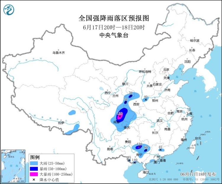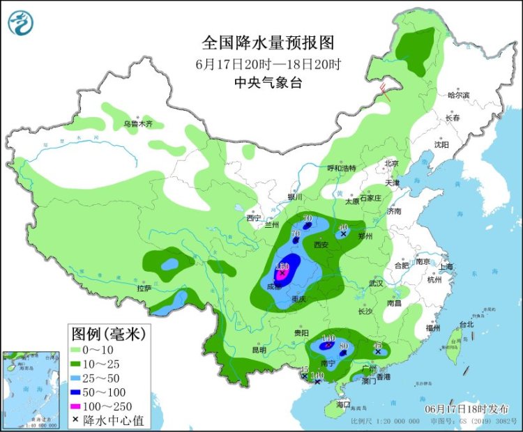 其中,预计6月17日20时至18日20时,甘肃东部和南部、陕西中部、四川盆地大部、广西中北部和南部沿海、广东中部和西南部沿海等地部分地区有大到暴雨,其中,四川盆地西北部、广西北部和南部沿海等地局地有大暴雨(100~150毫米)。上述部分地区伴有短时强降水(最大小时降雨量20~50毫米,局地可超过70毫米),局地有雷暴大风等强对流天气。中央气象台6月17日18时继续发布暴雨蓝色预警。